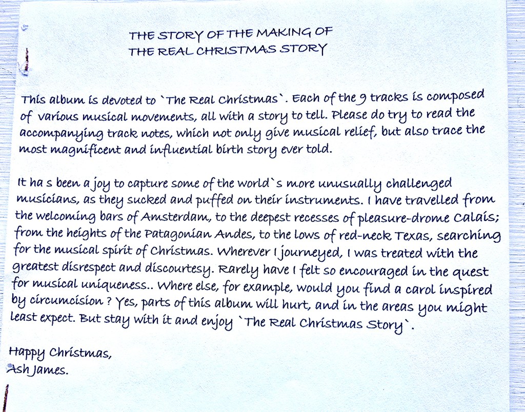 In 2004 I decided to gently supplement the traditional Christmas Carols offering with something just a little alternative. Two decades on The Real Christmas Story album returns, digitally enhanced but otherwise unharmed. Listen as you may to the conglomeration of musicianship that became a best seller, crafted in The Black Country region of the English Midlands. A delicate mix of the enthusiastically traditional and the cautiously irreverent, it has something for everyone, no matter how hard their hearing. So please, sit back, relax, join in even, with this joyous celebration of the Christmas Story.