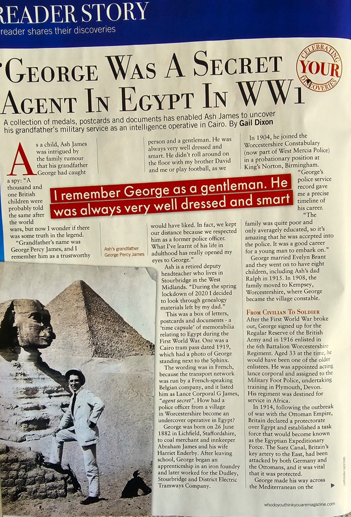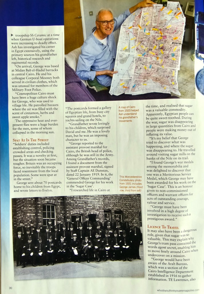 A 4-page interview in the prestigious magazine which accompanies the major BBC programme of the same name, about my grandad, George Percy James. He left a rich legacy of information about his time in Cairo in WW1, which together with other materials ultimately inspired me to write the fictional story of `The Poet Laurie Ate` .